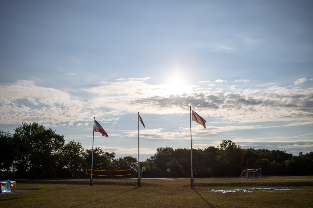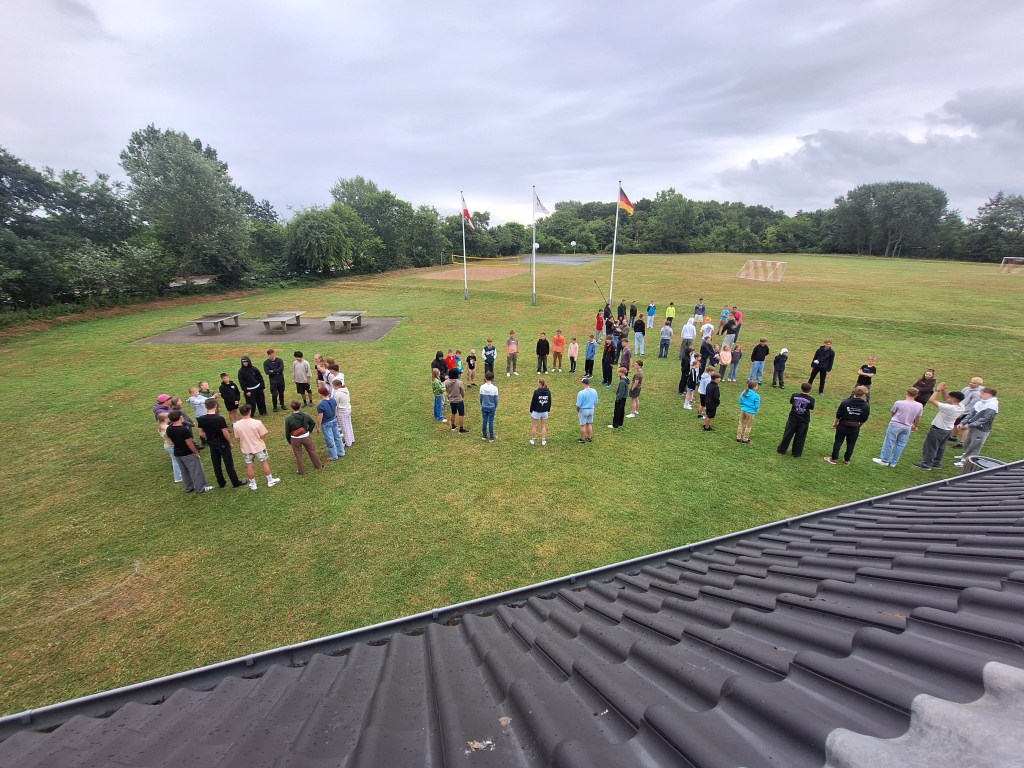 Das Hissen der selbsterstellten Freizeitfahne bei feierlicher Musik beendete heute statt des Tanzens das Morgenmeeting.