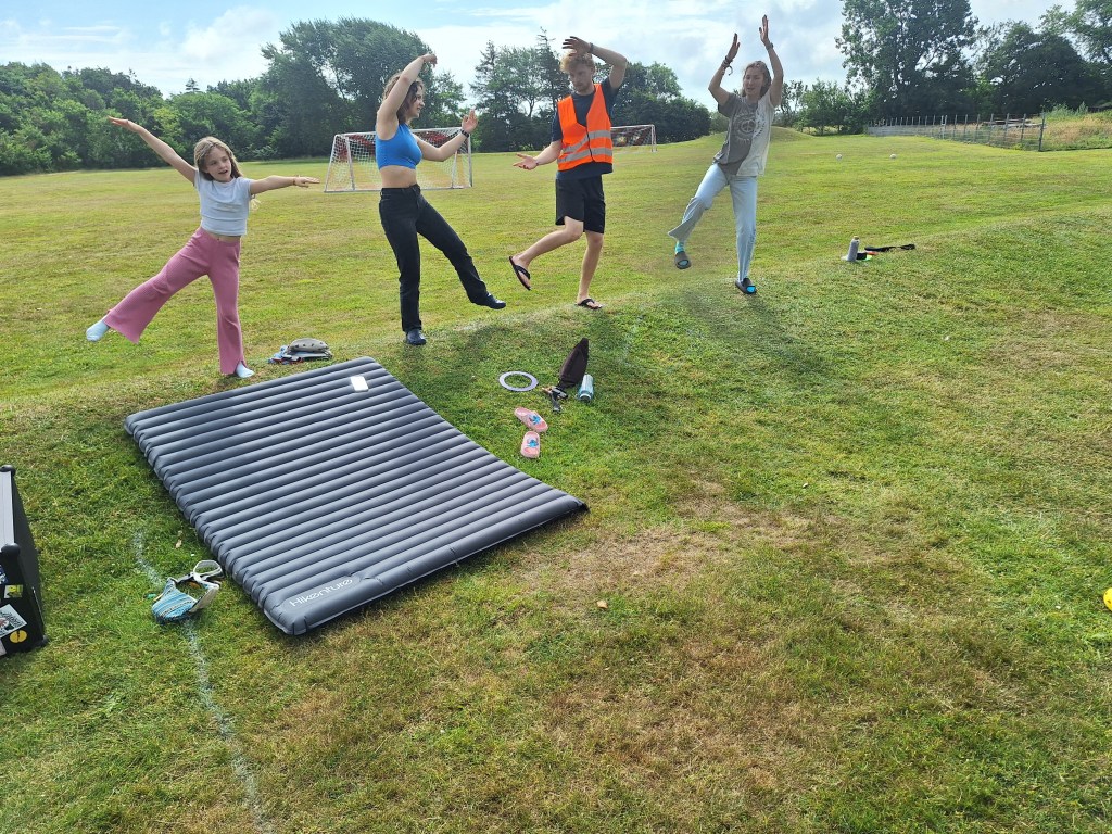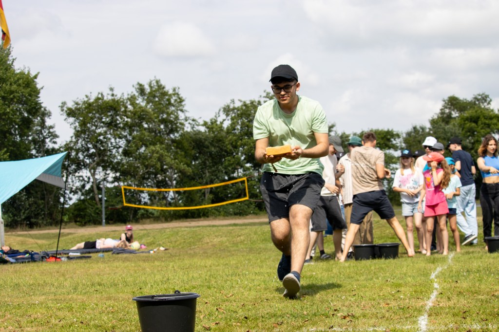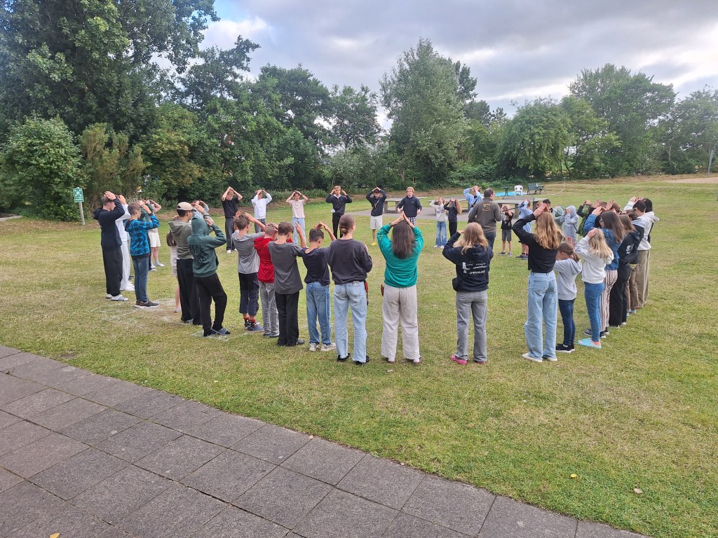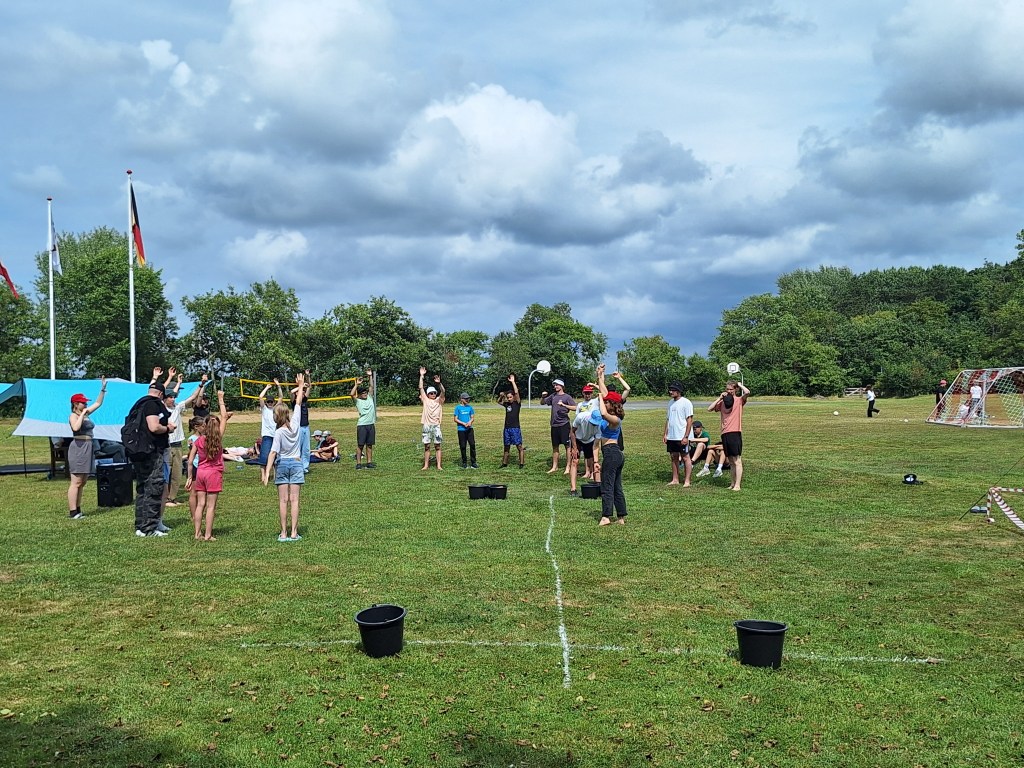 Team vs. Teilis musste heute ein vollgesogener Schwamm über eine Strecke getragen werden, um damit nach und nach einen Eimer zu füllen. Zum Aufwärmen gab es vorher Gymnastik