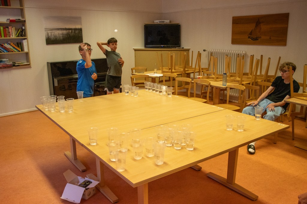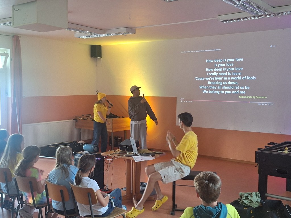 Team vs. Teilis war heute Liederraten. Es galt, möglichst nach ein paar Takten den jeweiligen Song zu erraten. Sehr, sehr knapp gewannen die Betreuer, sodass es jetzt 3:1 für die Betreuer steht.